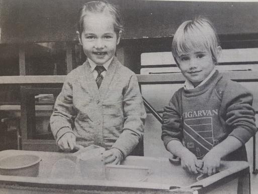 PHOTO 5: Judith McCarter, left, and Kylie McGavigan, playing in the sand on their first day in P1 at Artigarvan Primary School in September of 1992.