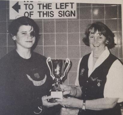 PHOTO 6: Val Jack, left, receiving the Uninhibited Cup for best junior girl swimmer at Riversdale Otters gala in 1994 from Mrs McCosker.