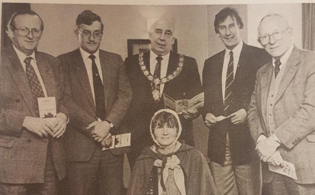 PHOTO 3: Pictured at the launch of the Homecoming Festival in the Strabane area in 1992 were, from left, Dr Victor Eakin, chief executive of Strabane District Council, Mr Eddie O'Kane, chairman of Strabane Arts Academy Committee, Mr Edward Turner, council chairman, and Dr Denis McNiece and Mr Eric Montgomery, of the Ulster American Folk Park. Seated in Jane Hubbard, from the curatorial staff at the park.