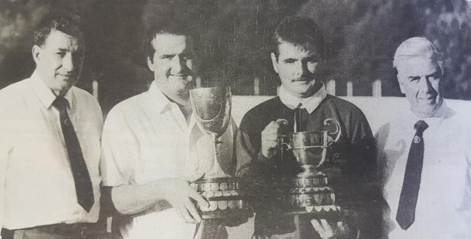 PHOTO 4: Donemana 1st XI captain, James McBride, second from left, and 2nd XI captain, Noel Dunn, second from right, pictured in 1992 after receiving the Senior League and Intermediate League trophies. Also in the picture are members of the North West Umpire’s association, Sam McConnell, Intermediate League for the seventh consecutive time. Both achievements were records in the North West
