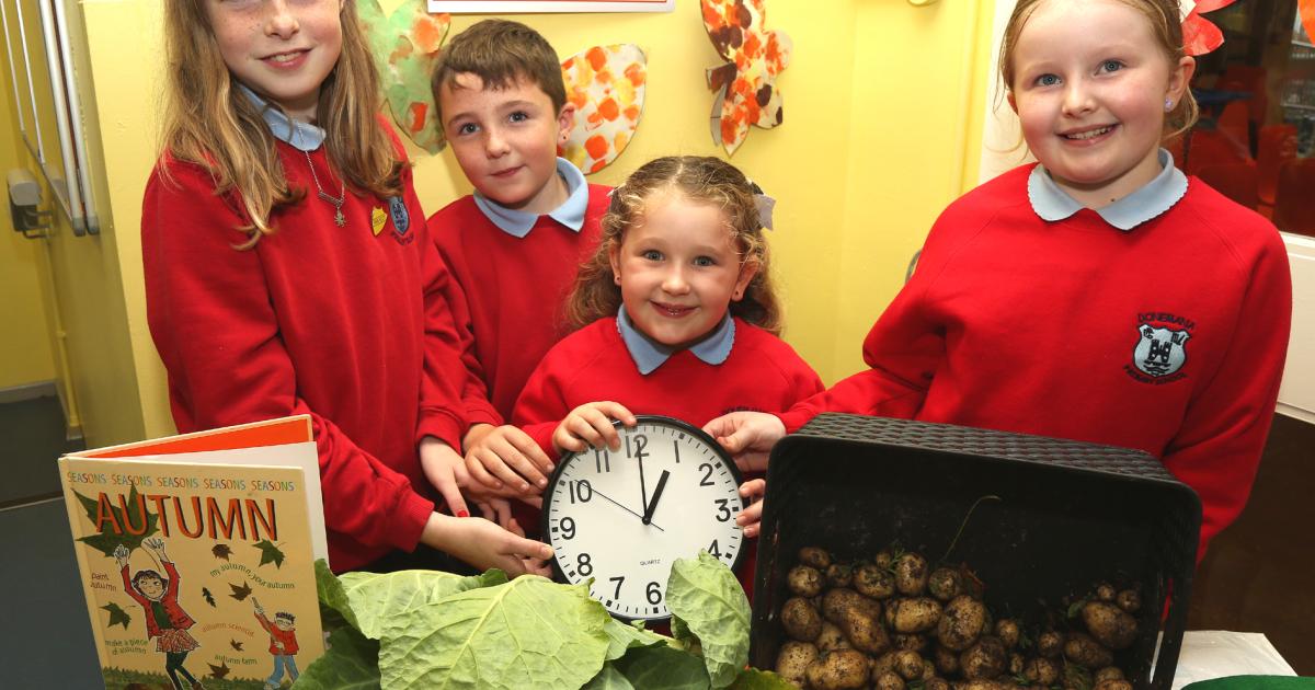 Donemana Primary School pupils, Mollie, Alfie, Amber and Molly-Mai, remind Strabane Weekly News readers to put their clocks BACK one hour tonight (Saturday).