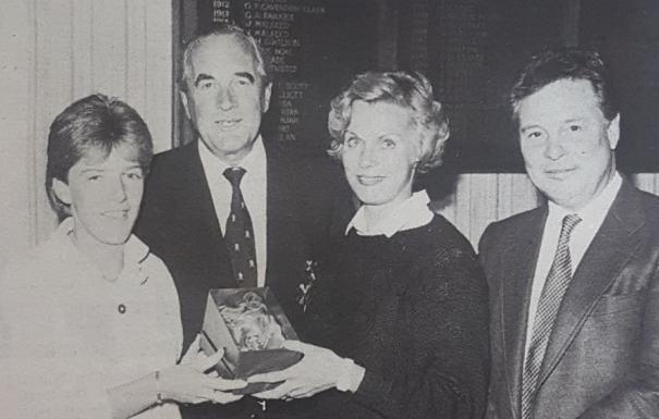 Mrs H Jones (left) of Strabane Golf Club, was the winner of the best gross at the finals of the 'New Zealand Lamb' Sports Trust Golf tournament, played at Masserene in 1985. Also pictured are (from left) Mr Stuart Pollock, chairman of the Ulster Sports and Recreation Trust, Mrs Trautmann, and Mr Erick Trautmann, European Director of New Zealand Meat Producers' Board.