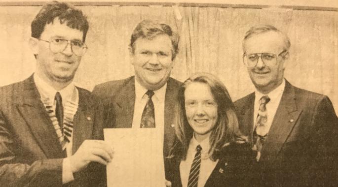 The winner of the local heat of the Rotary Young Leaders competition in 1992 was Emer Doherty, of Strabane Convent Grammar. She is pictured receiving her award from the president of Strabane/Lifford Rotary Club, Mr Brian Peoples. Also in the picture are two of the organisers of the local heat, Mr John MacCrossan and Mr David Hudson.